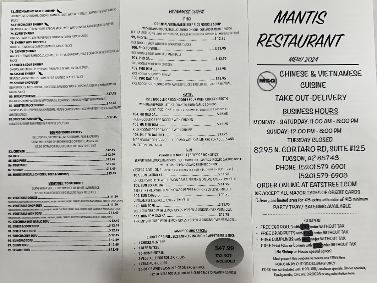 At Mantis Gourmet Chinese Food Menu, you’ll find a delightful array of authentic Chinese dishes, each crafted to perfection. From mouthwatering appetizers to rich, flavorful entrees, the menu offers something for everyone. Whether you’re in the mood for savory dumplings, crispy spring rolls, or a hearty bowl of noodles, you’re sure to discover your new favorite dish. The flavors are bold and vibrant, reflecting traditional Chinese cooking techniques with a modern twist. With its inviting atmosphere and carefully curated menu, dining at Mantis Gourmet is an experience that brings the essence of Chinese cuisine straight to your table. Don’t miss out on the unique and unforgettable flavors waiting to be explored.
